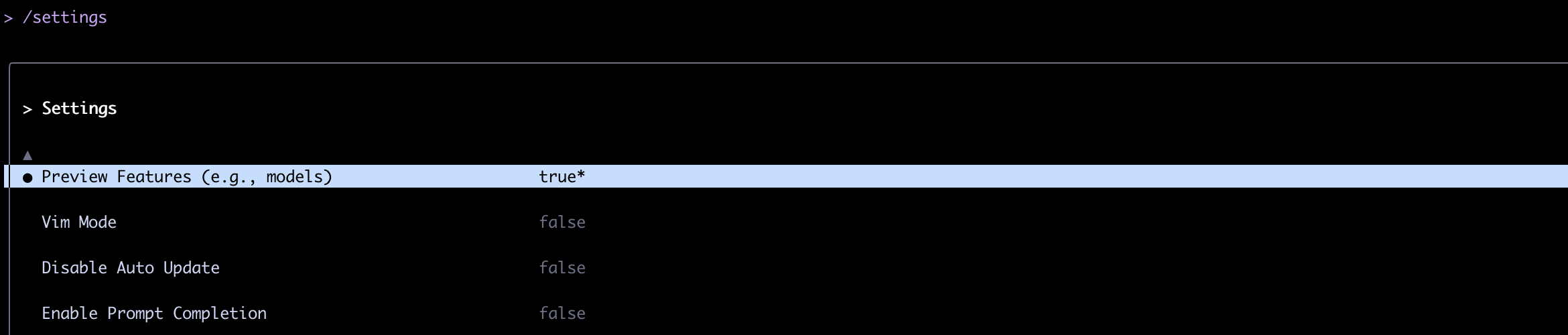 /settings 然后 开发 Preview Features\n