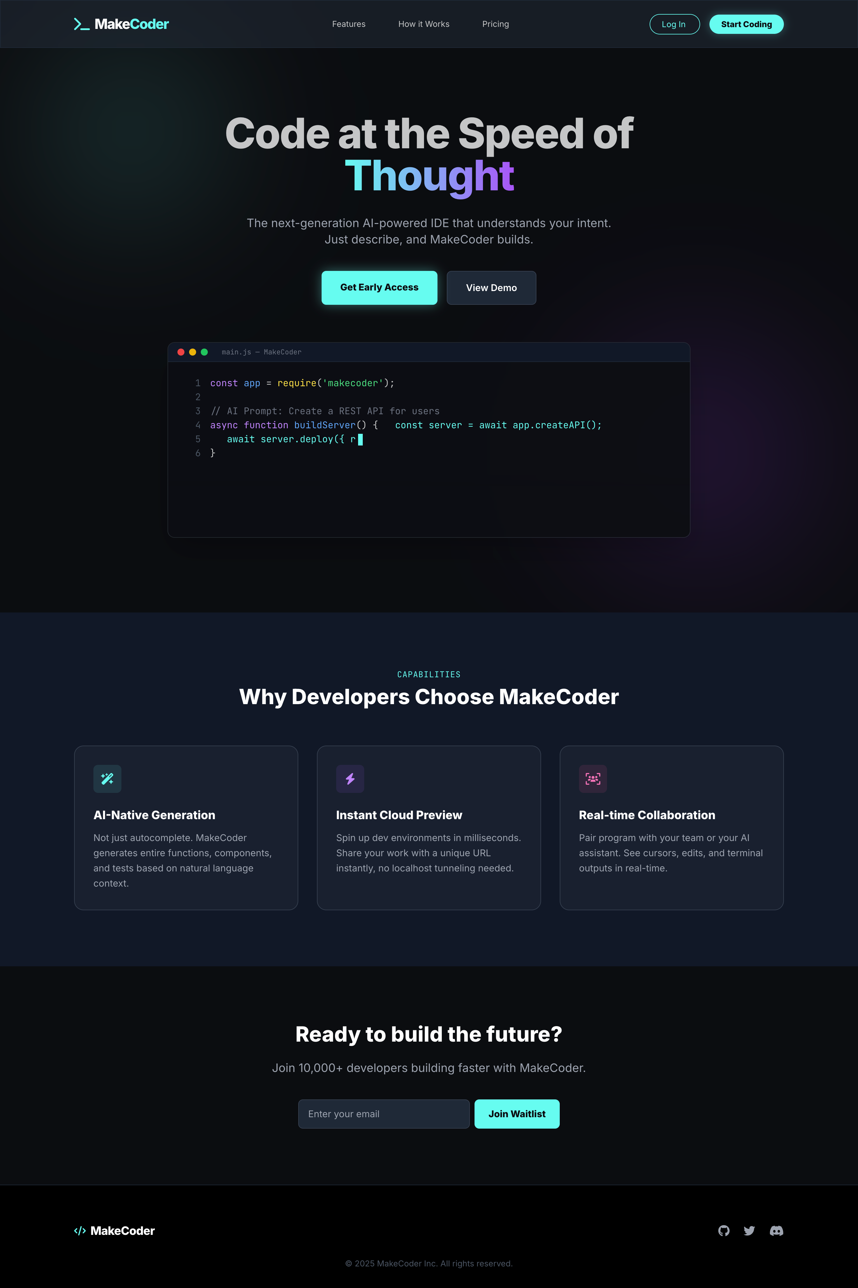 为 MakeCoder 开发一个首页,用 html/js 等,不需要后端\n非常快的,他就生成好了,效果如下图,文案、设计、动效等包括细节都非常强:https://demo001.coder.pub/\n
