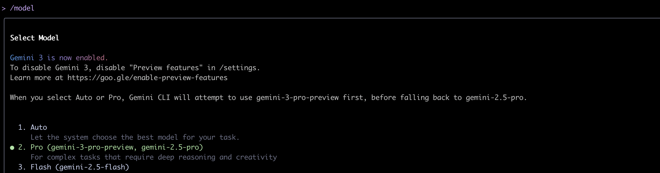 选择模型,/model 然后选择 Pro\n