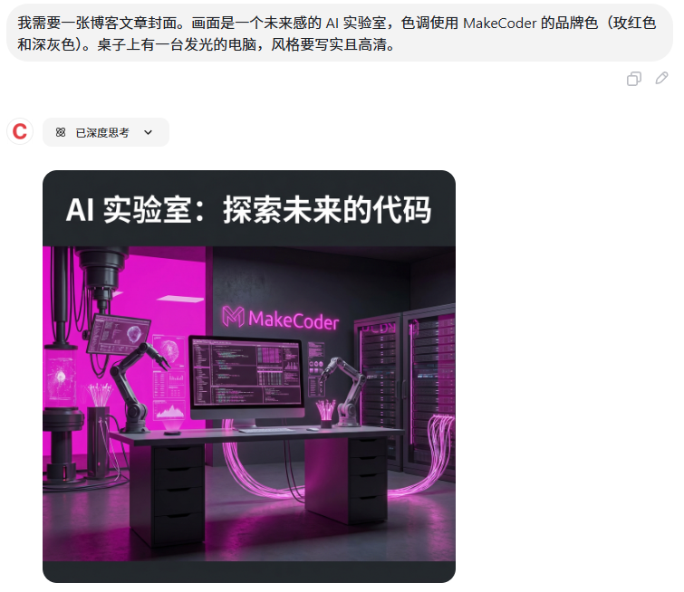 用户输入: "我需要一张博客文章封面。画面是一个未来感的 AI 实验室,色调使用 MakeCoder 的品牌色(玫红色和深灰色)。桌子上有一台发光的电脑,风格要写实且高清。"