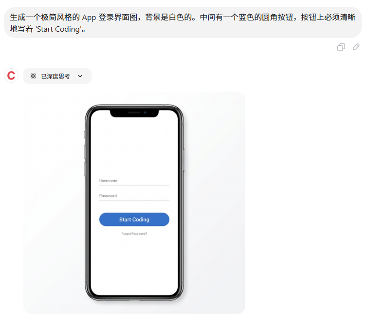 用户输入: "生成一个极简风格的 App 登录界面图,背景是白色的。中间有一个蓝色的圆角按钮,按钮上必须清晰地写着 'Start Coding'。"