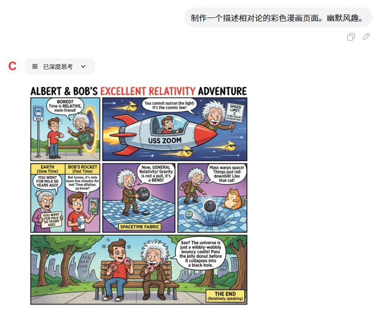 用户输入: "制作一个描述相对论的彩色漫画页面。幽默风趣。"