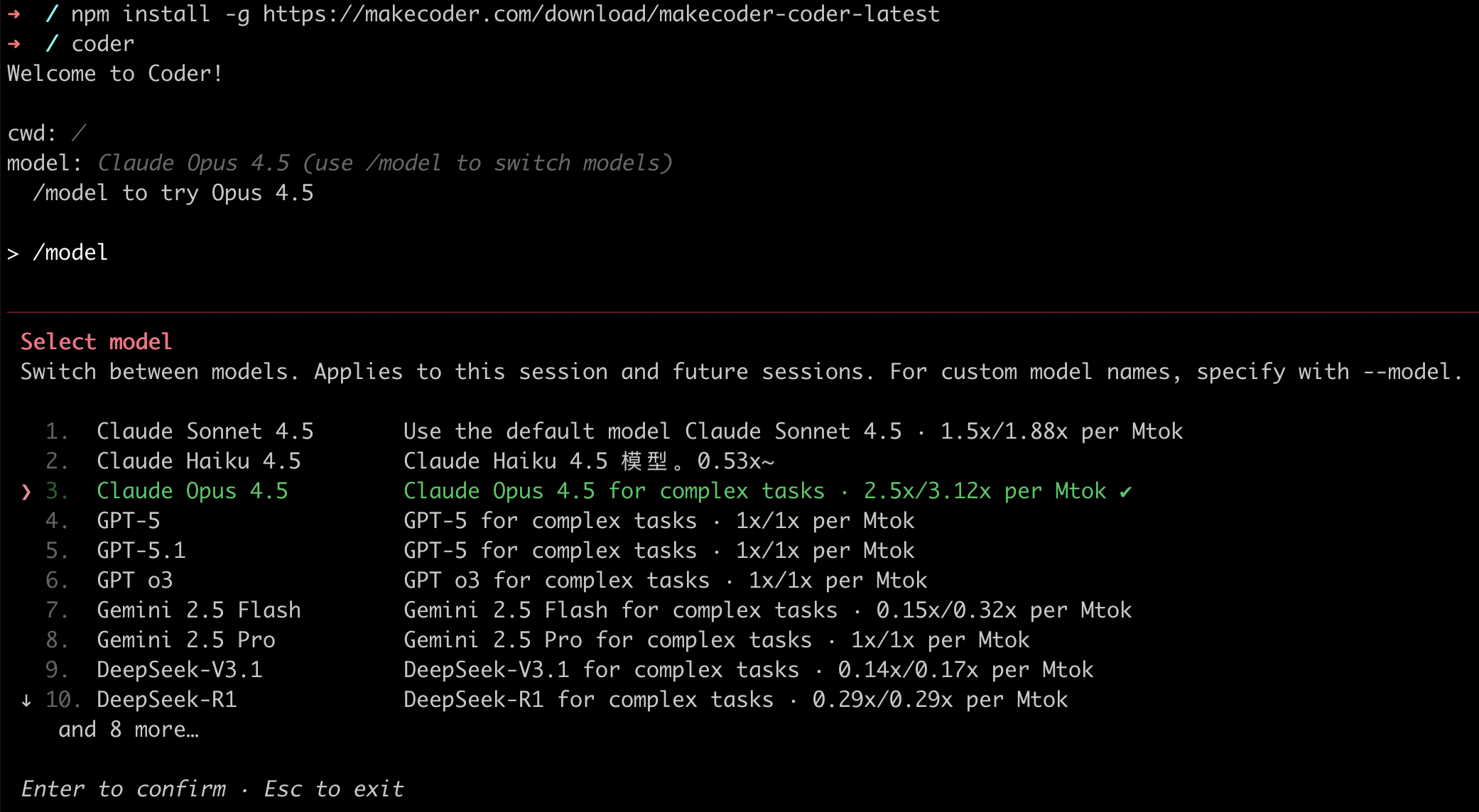 这是 MakeCoder 的核心生产力工具。Coder 是一个运行在终端的命令行智能体,内置了 Claude Code、Gemini CLI、Codex CLI 等内核,零配置即可使用。